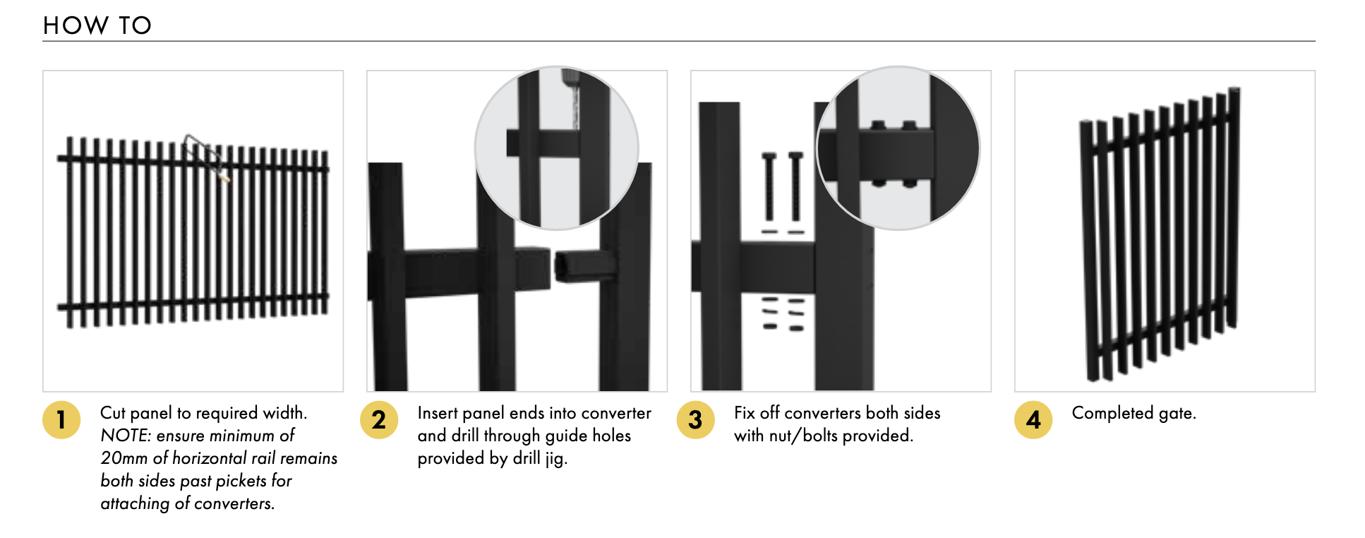 • Gate converter stiles are 40x40mm which matches fully welded BLADE pedestrian gates